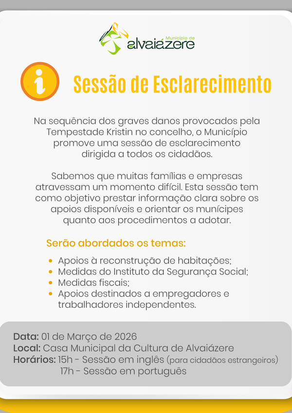 ℹ️ 𝗦𝗘𝗦𝗦𝗔̃𝗢 𝗗𝗘 𝗘𝗦𝗖𝗟𝗔𝗥𝗘𝗖𝗜𝗠𝗘𝗡𝗧𝗢 – 𝗧𝗲𝗺𝗽𝗲𝘀𝘁𝗮𝗱𝗲 𝗞𝗿𝗶𝘀𝘁𝗶𝗻 Na sequência dos graves danos provocados no concelho, a Câmara Municipal de ...2026/03/01 -