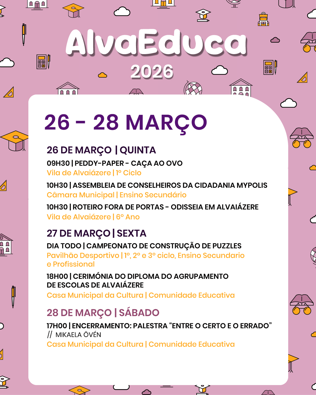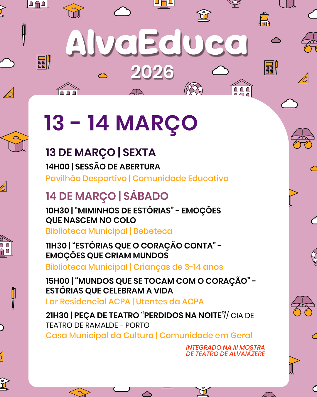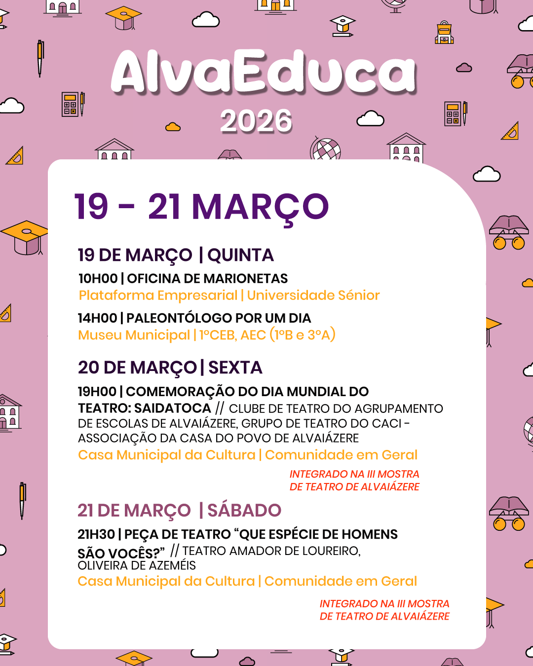 Entre 𝟭𝟯 𝗲 𝟮𝟴 𝗱𝗲 𝗺𝗮𝗿𝗰̧𝗼, o concelho de Alvaiázere volta a receber um conjunto de atividades, encontros e iniciativas dirigidas a alunos, educadores, famílias e a toda a comunidade.