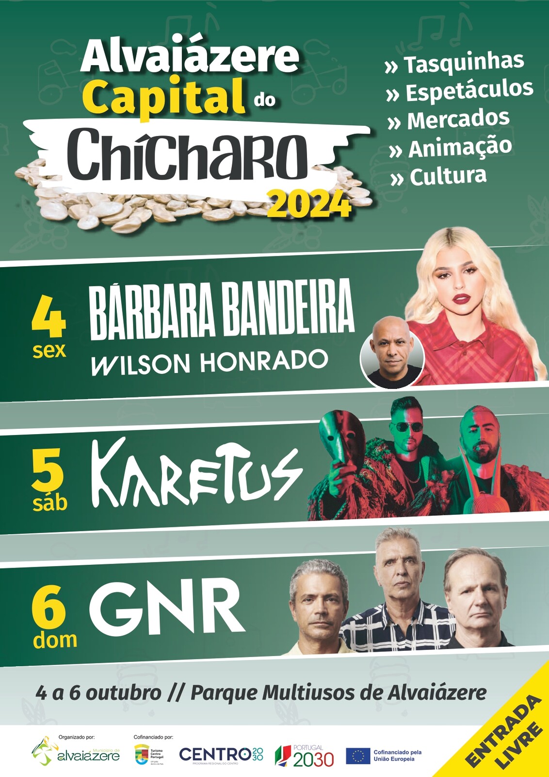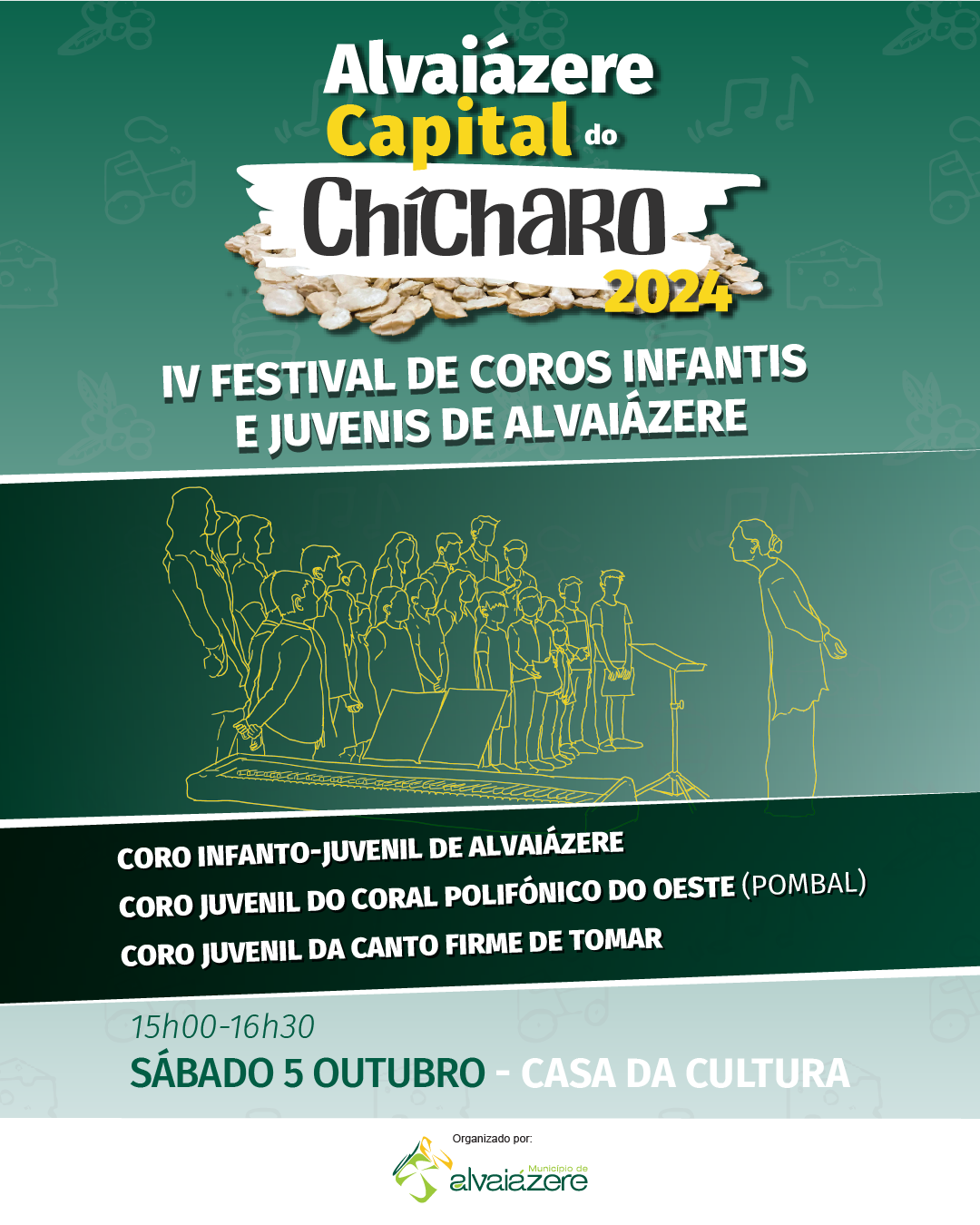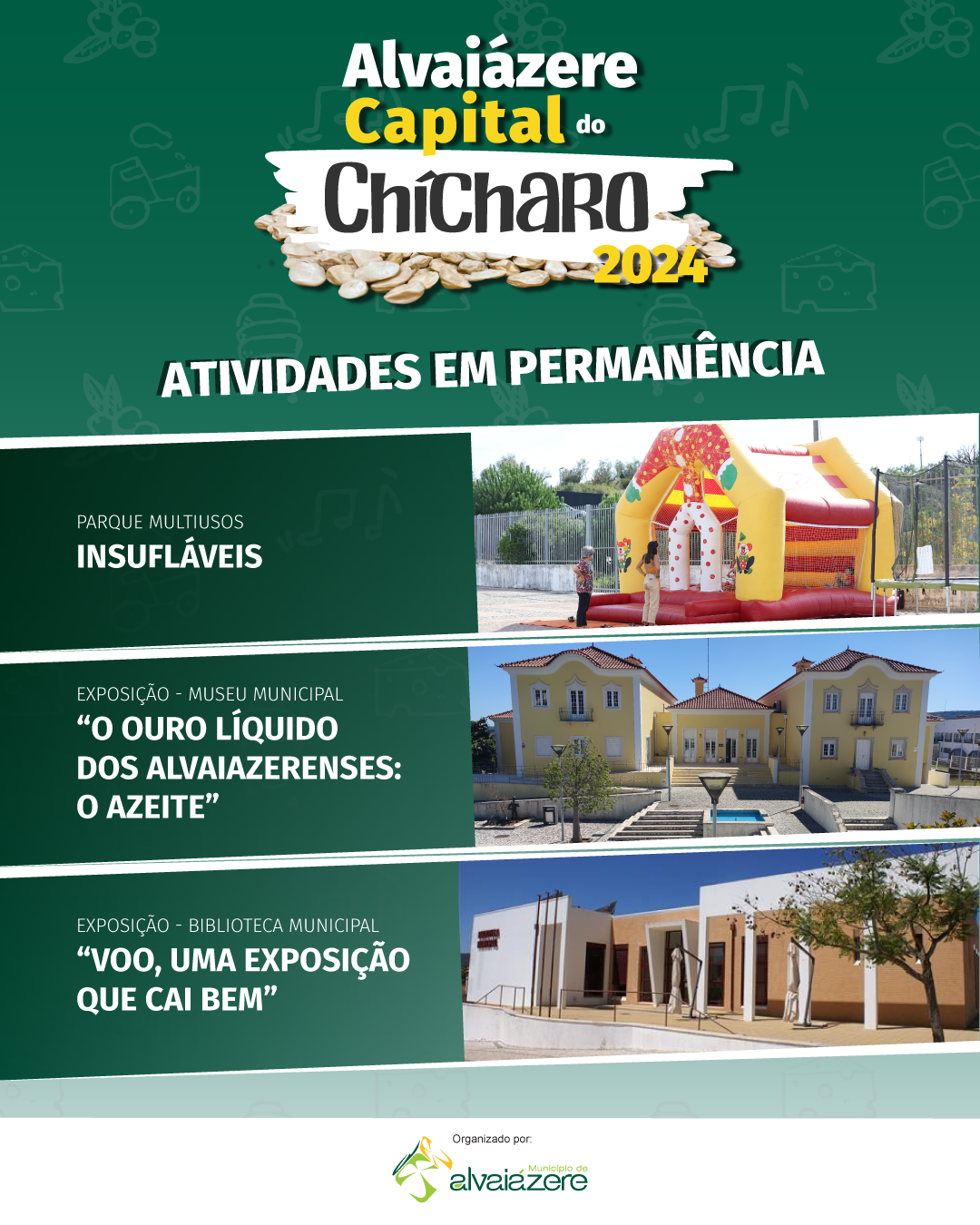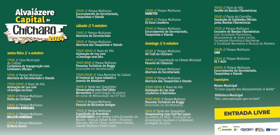 Alvaiázere volta a ser palco de furor cultural entre os dias 4 e 6 de outubro de 2024, em que as exposições, os espetáculos, tasquinhas, passeios turísticos, mercado de produtos endógenos, artesanato e velharias e a animação de rua surgem entretecidos pelos sabores da gastronomia local em que o chícharo é rei.