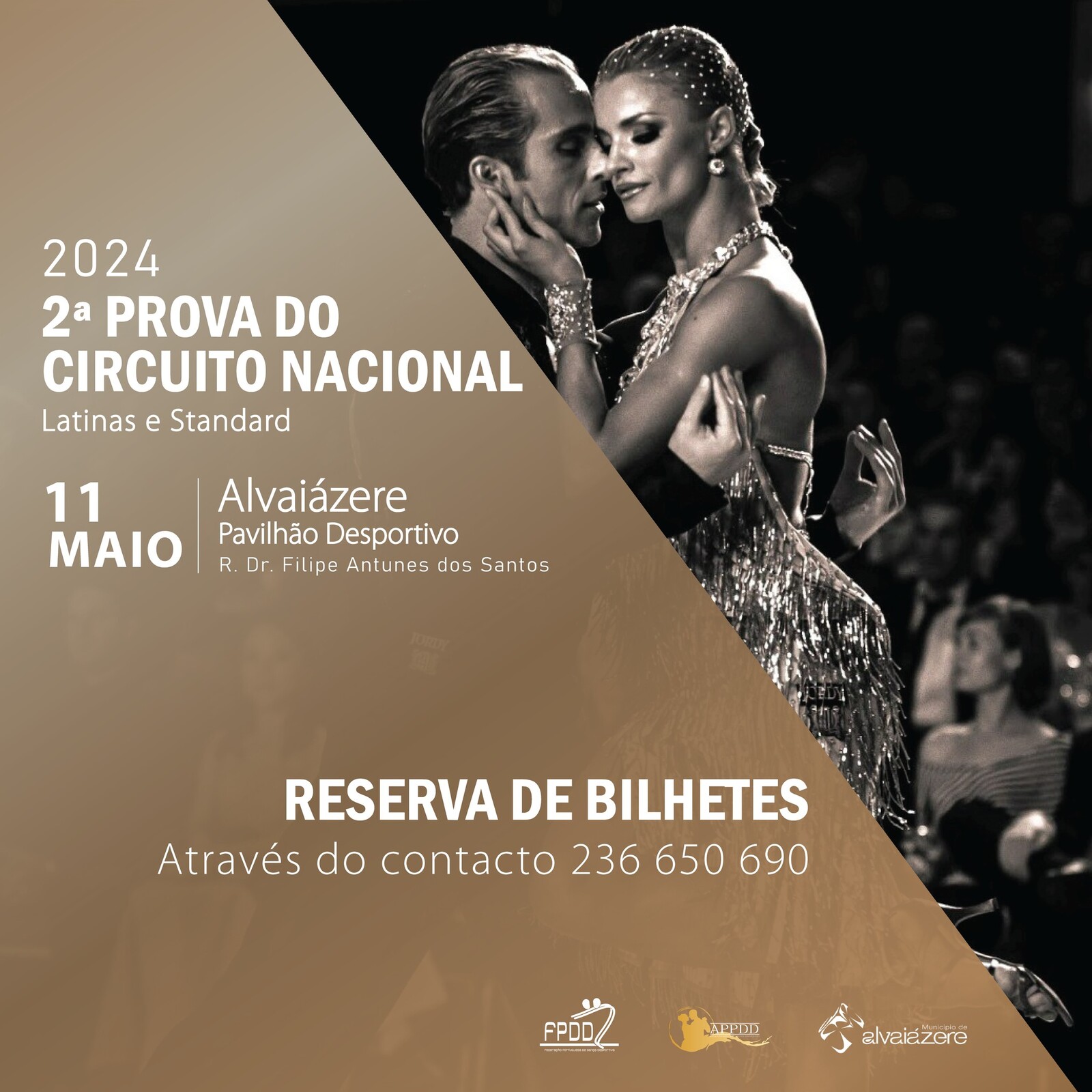 A 2ª Prova do Circuito Nacional de Latinas e Standard será realizada no Pavilhão Desportivo de Alvaiázere pelas 12h00. O Município disponibiliza gratuitamente o bilhete aos alvaiazerenses interessados que se inscrevam gratuitamente.