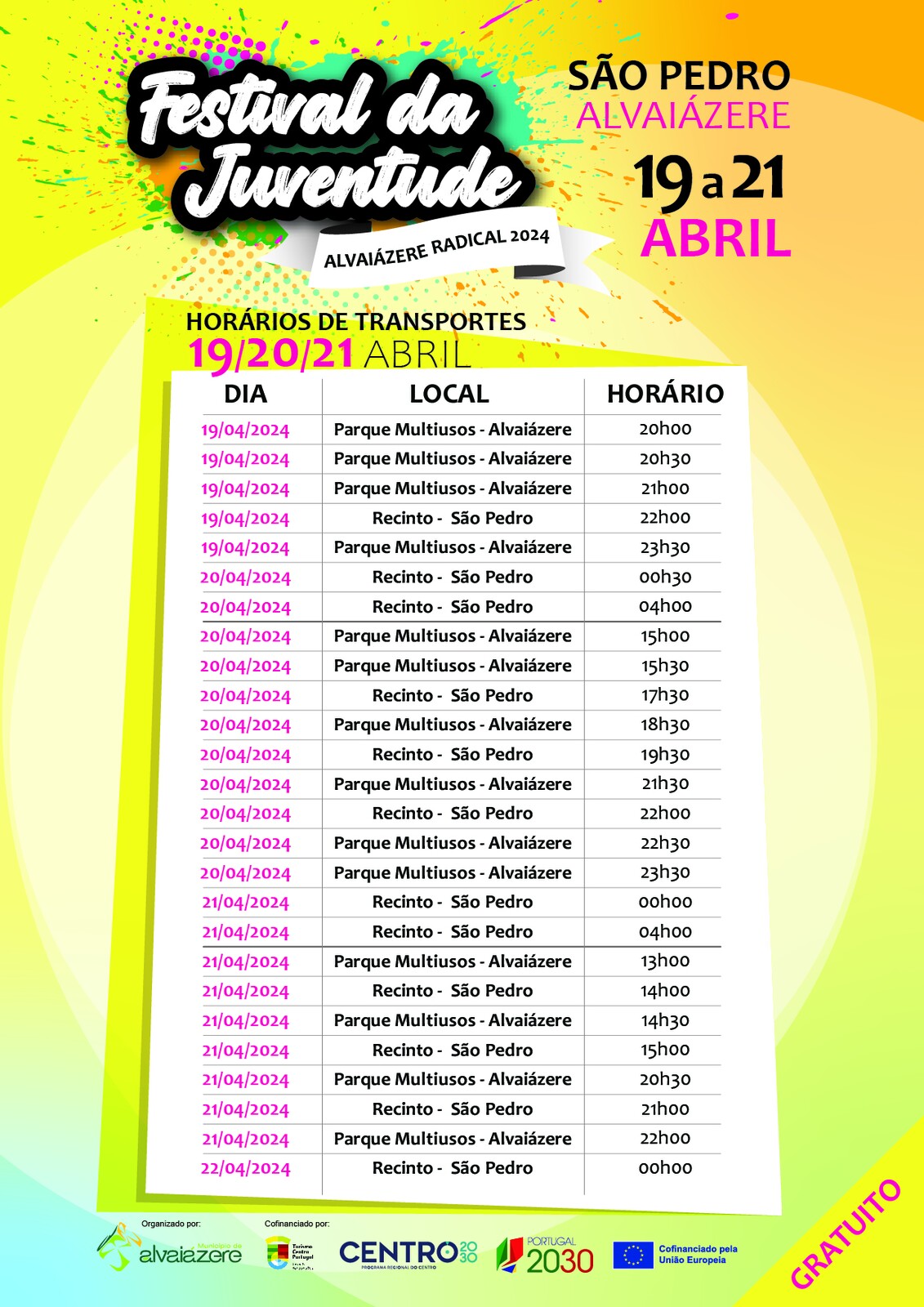 Para facilitar a deslocação dos jovens a partir da sede de concelho(Parque Multiusos de Alvaiázere), a organização do evento preparou transportes que estarão especialmente disponíveis durante os dias do festival. Os horários detalhados dos transportes, bem como os locais de partida e chegada, serão divulgados antecipadamente nas plataformas digitais do Município.