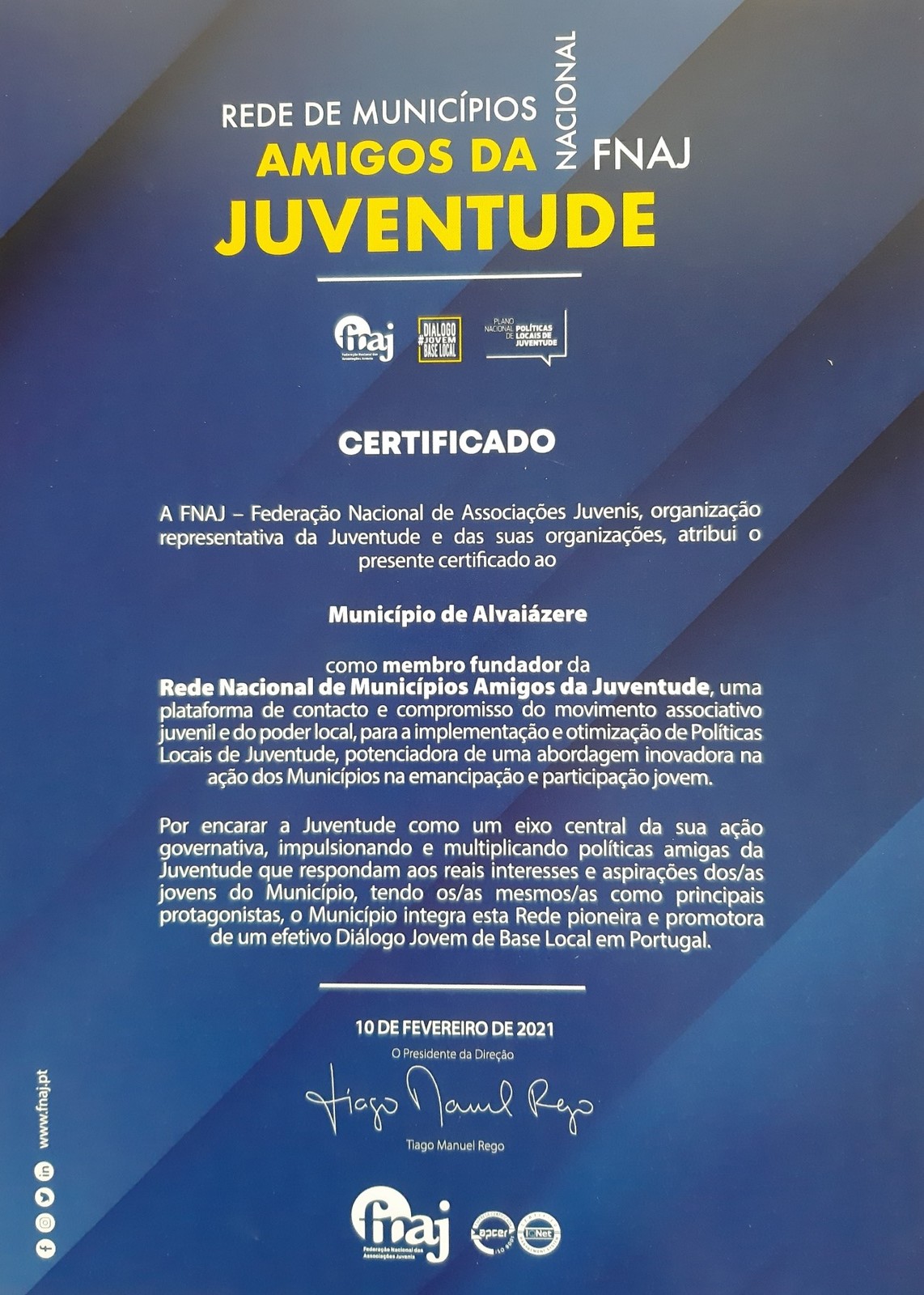 A Federação Nacional das Associações Juvenis (FNAJ) atribuiu ao Município de Alvaiázere o certificado de membro fundador da Rede Nacional de Municípios Amigos da Juventude e que hoje nos foi entregue, como reconhecimento pelas políticas de juventude que o Município tem desenvolvido ao nível das atividades desportivas, educativas, culturais e sociais.