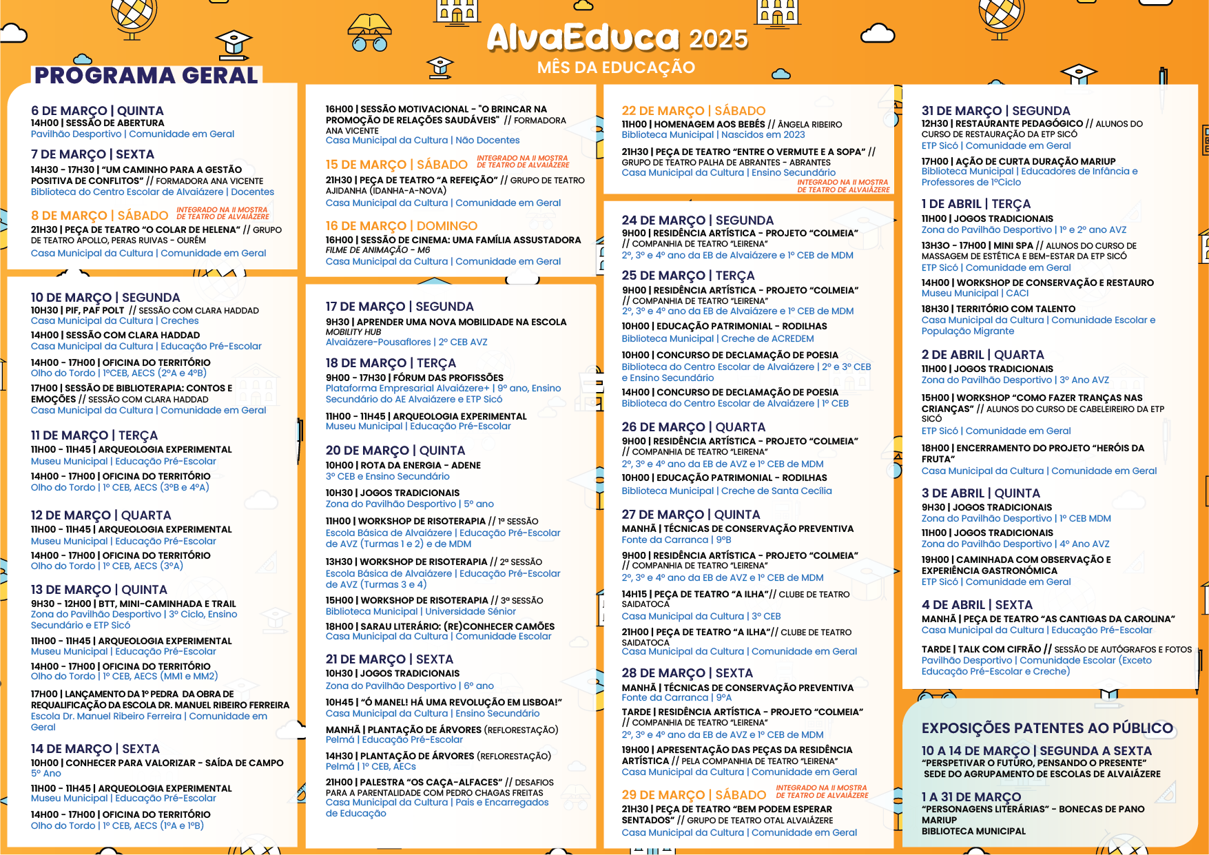 O AlvaEduca - Mês da Educação está de volta ao concelho de Alvaiázere para mais uma edição, que decorrerá de 6 de março a 4 de abril. Promovido pela Câmara Municipal de Alvaiázere, este evento dirige-se à comunidade escolar e está aberto a toda a população, reforçando o compromisso do município com uma educação de qualidade, inclusiva e transformadora.