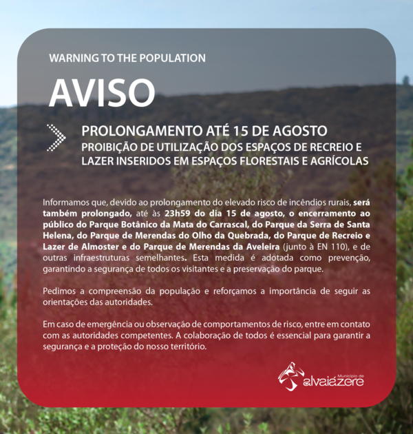 Informamos que, devido ao prolongamento do elevado risco de incêndios rurais, será também ...14 Agosto 2025 -